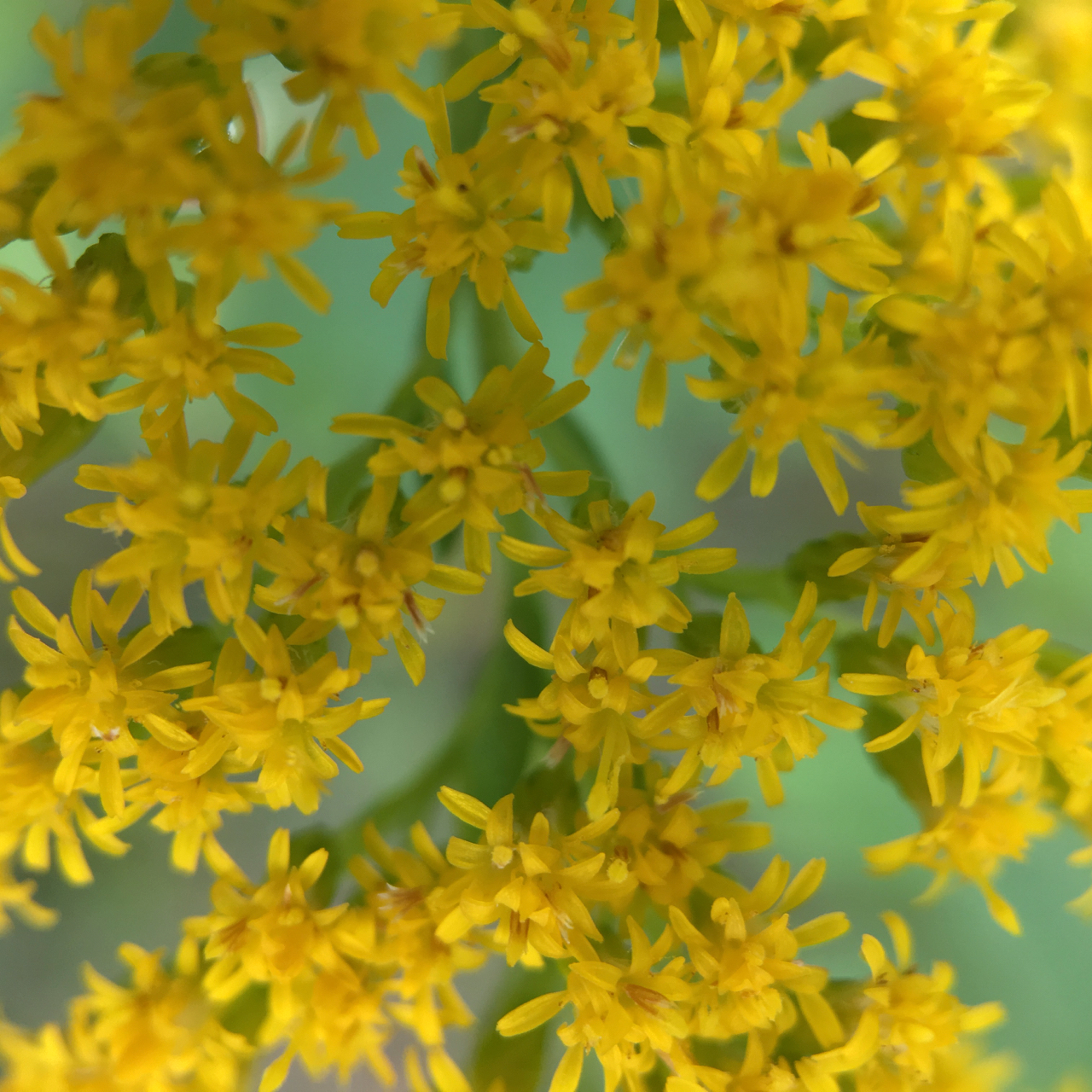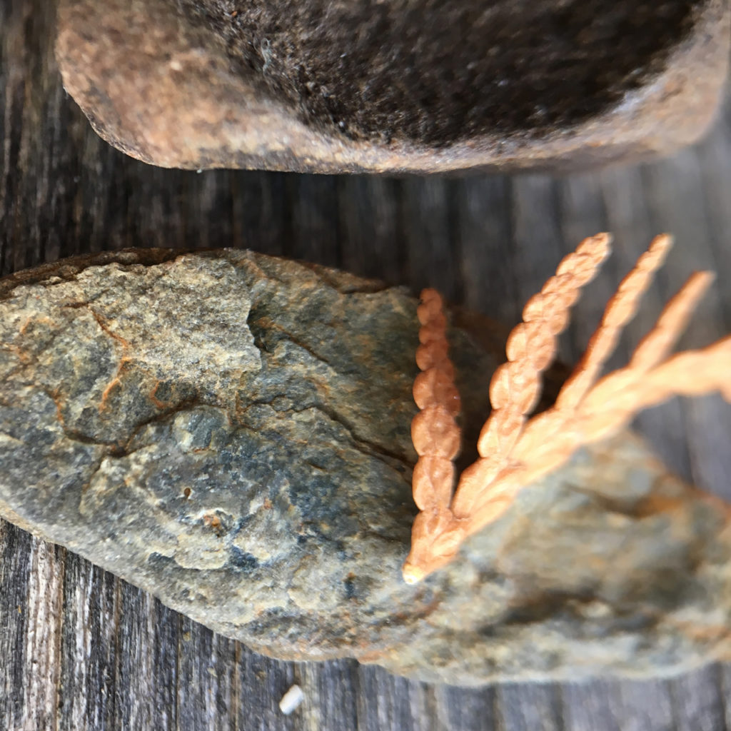 macro shot of seed heads of wild grasses draped on top of sumac leaf slightly crimsoned